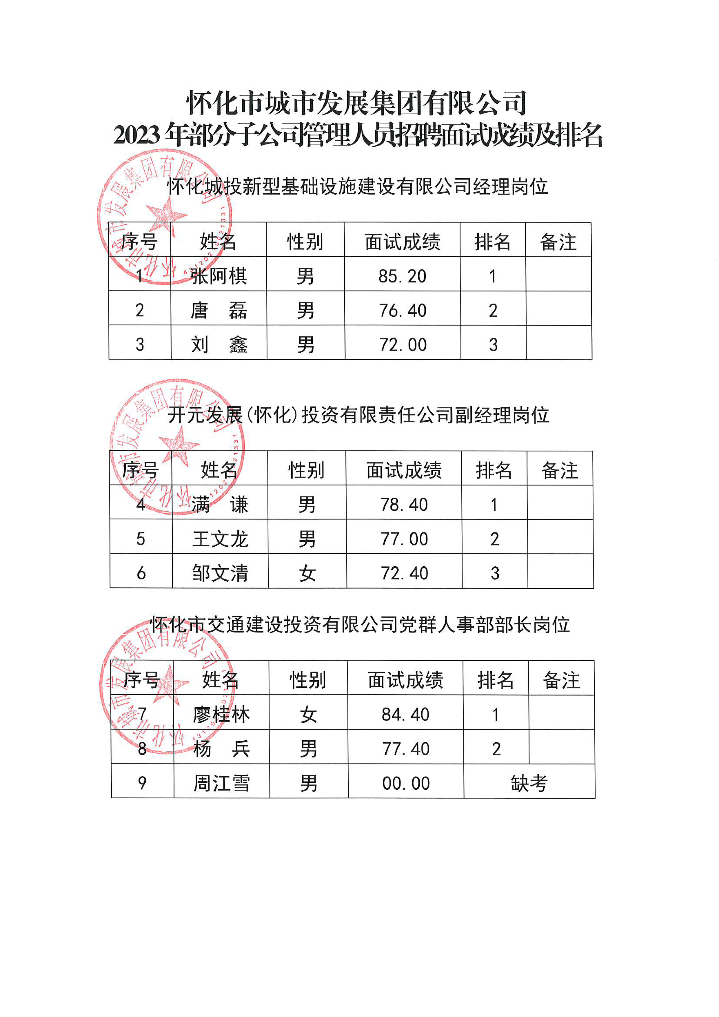 懷化市城市發(fā)展集團(tuán)有限公司2023年部分子公司管理人員招聘面試成績及排名